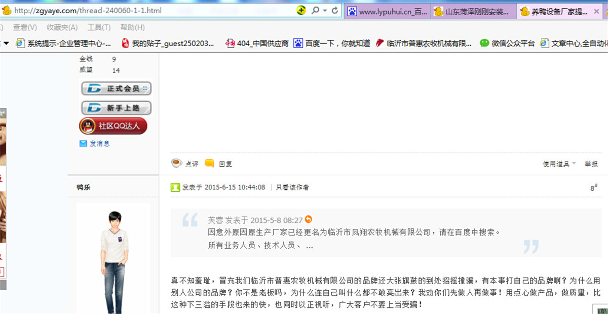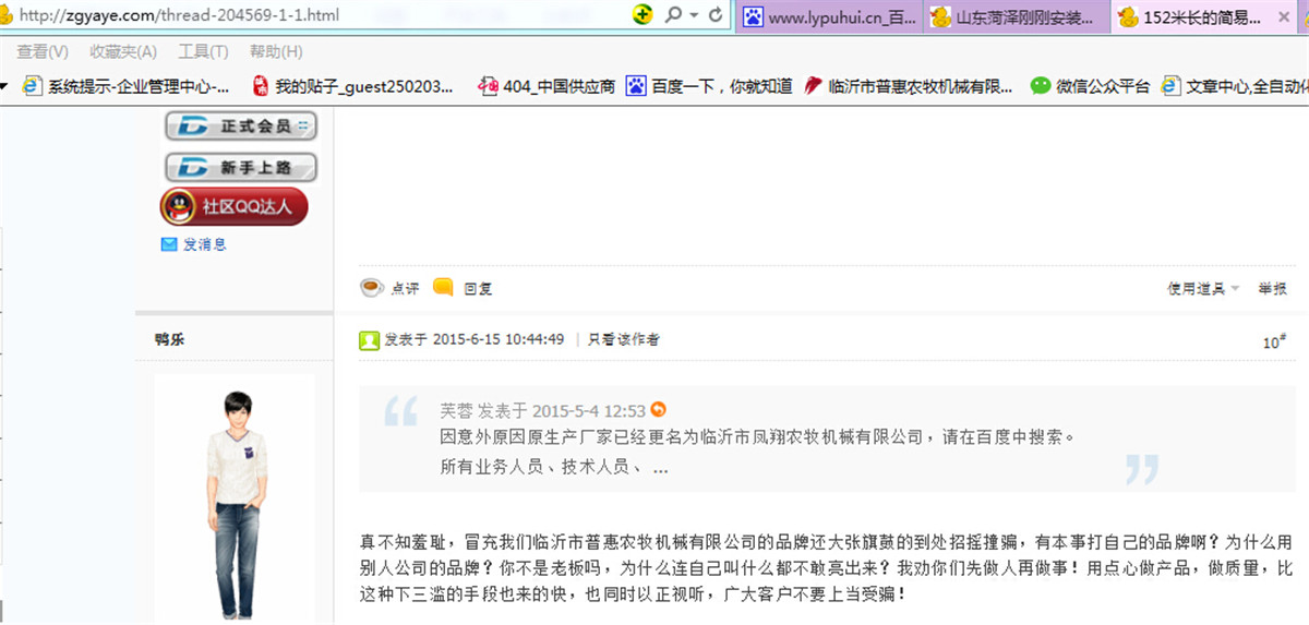 請大家注意下本帖子的發(fā)帖時間,我們是2015年3月1日被臨沂市普惠農(nóng)牧清退的,同月11日才注冊臨沂市鳳翔農(nóng)牧機(jī)械有限公司,現(xiàn)在他們說我們招搖撞騙,說我們下三亂,請各位鴨友評論下,都是做公司,都是合法經(jīng)營,為社會納稅,為什么要一次次這樣攻擊我們呢??如果把我們還在他們普惠農(nóng)牧沒有退出時候發(fā)出的帖子也定性為是招搖撞騙的話,是不是臨沂市普惠農(nóng)牧也否定了自己,承認(rèn)了自己是招搖撞騙???