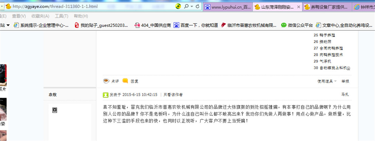 各位鴨友大家好,我是臨沂市鳳翔農(nóng)牧機(jī)械有限公司朱紅星,我的合伙人叫張紅軍,我們都是原來臨沂市普惠農(nóng)牧機(jī)械有限公司的創(chuàng)始人.我和張紅軍兩人在今年之前分別負(fù)臨沂市普惠農(nóng)牧機(jī)械有限公司的銷售與技術(shù)開發(fā)(老客戶提起我們的名字都知道).我們于2015年3月1日被臨沂市普惠農(nóng)牧機(jī)械有限公司以”莫須有”的借口要求退出股份,同時退出的還有另外一個股東,現(xiàn)在已經(jīng)回到湖北開了一個養(yǎng)鴨設(shè)備廠家(鐘祥市久瑞農(nóng)牧機(jī)械廠),至此,臨沂市普惠農(nóng)牧機(jī)械有限公司原來所有關(guān)鍵技術(shù)人員與關(guān)鍵業(yè)務(wù)人員已經(jīng)全部離開,就一個空殼存在.